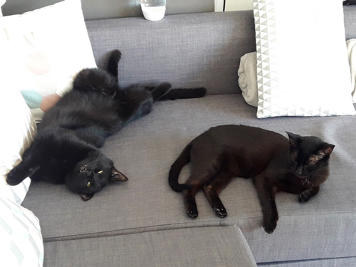 J’ai bon espoir qu’ils se rapprochent, à leur rythme. Je suis incapable de dire s’ils se feront un jour des câlins, mais en tout cas je vois régulièrement des progrès entre eux : Freyja se laisse maintenant renifler sans rien dire, et s’ils ne dorment pas collés l’un à l’autre, il n’est pas rare de les voir allongés à quelques dizaines de centimètres l’un de l’autre sur le canapé ou sur la table.